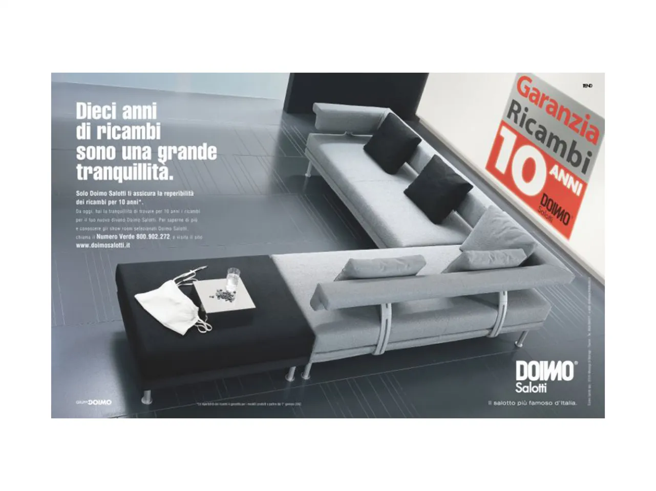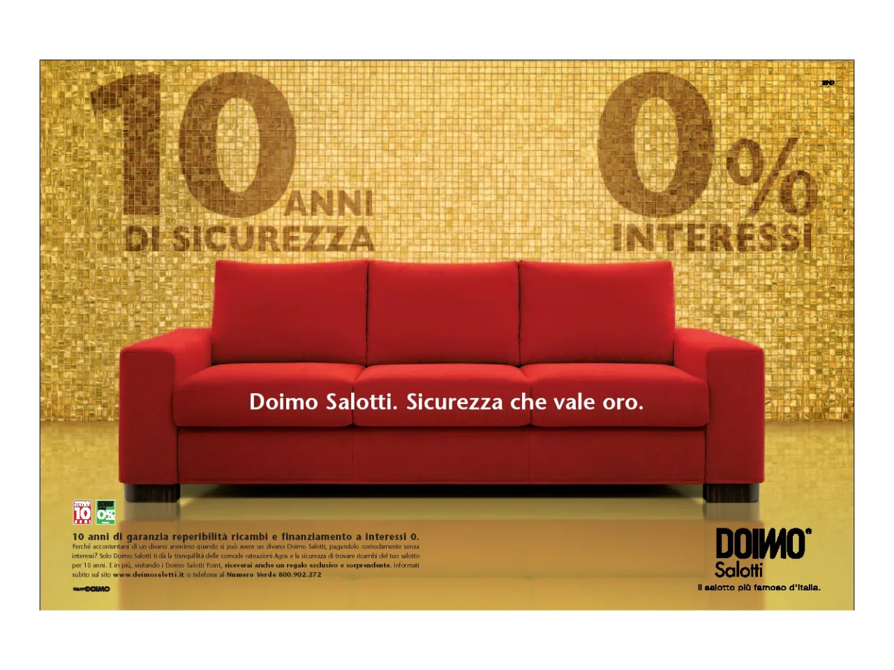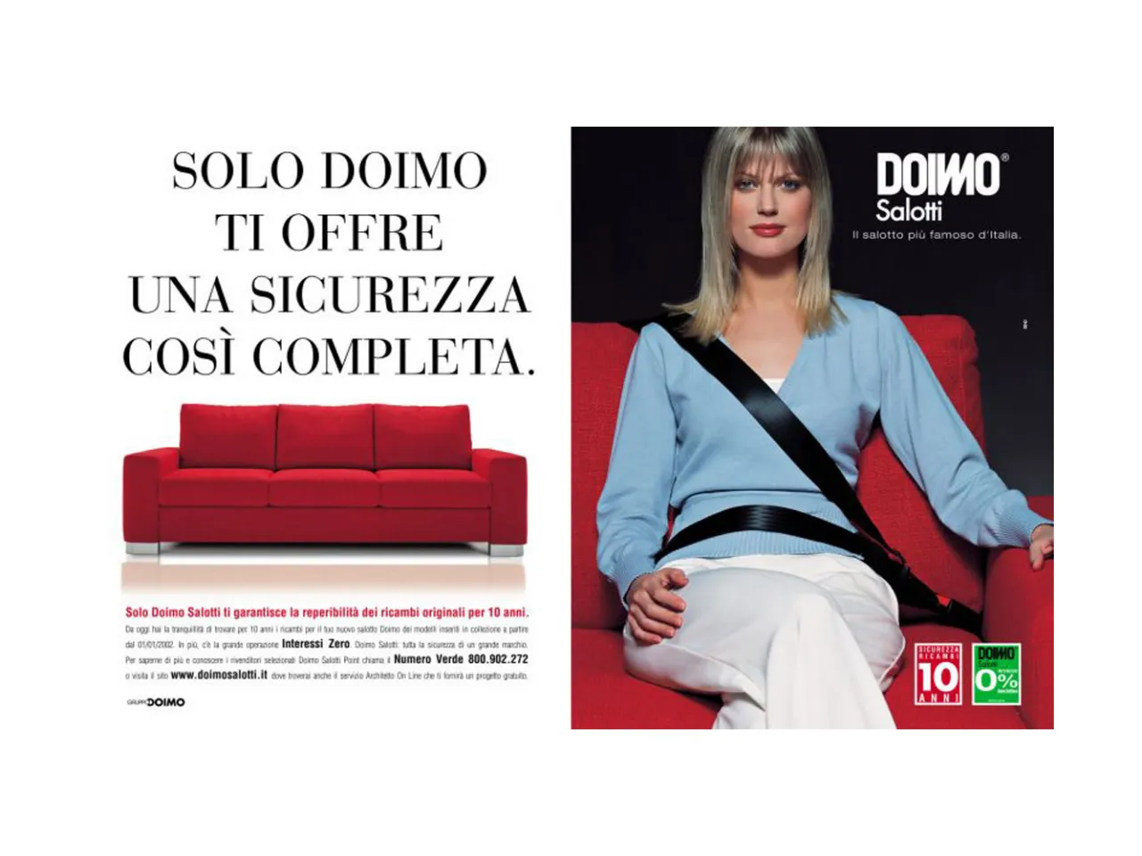 Advertising campaign dedicated to the tools offered by Doimo Salotti for a warranty service after the purchase, thanks to the possibility of the loan at rate 0 and on availability of the coverings even after 10 years from the release of the model.