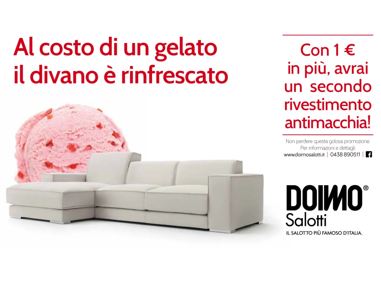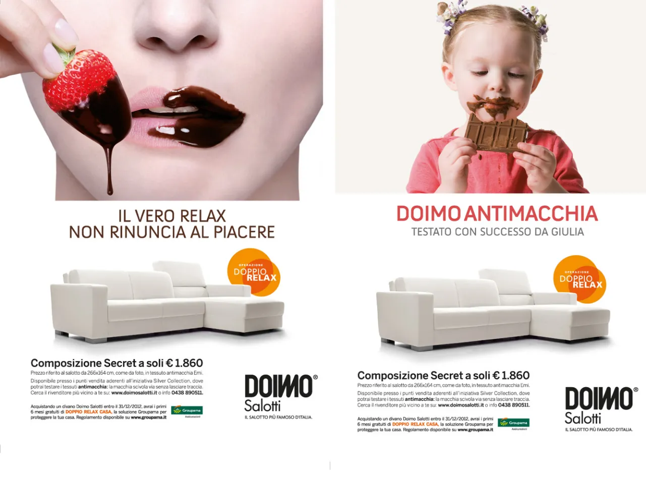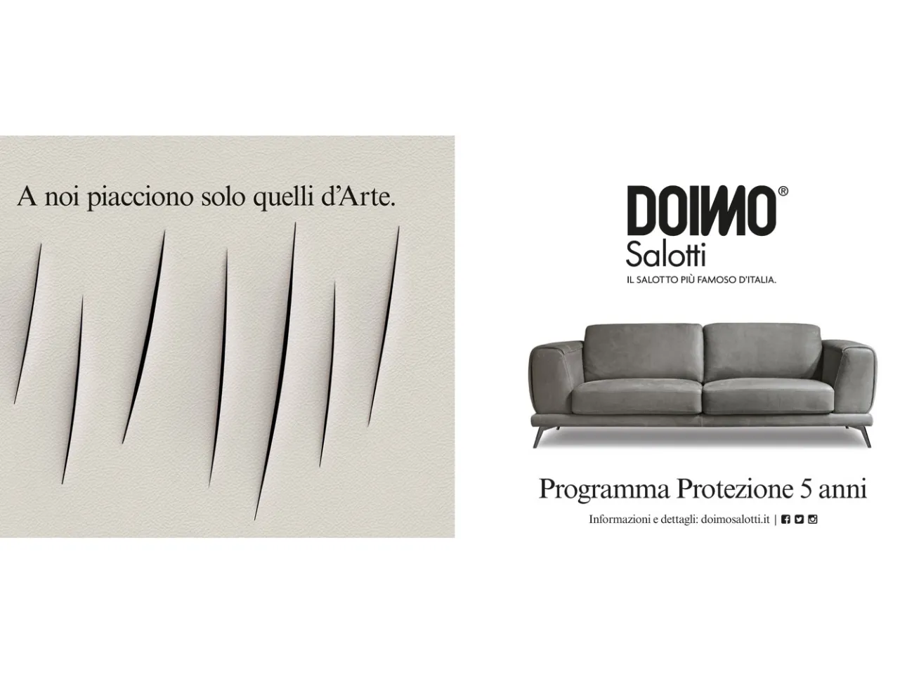 Enjoy your new sofa without any concerns, aware of being protected against all the minor occasional accidents that can happen. Doimo Salotti in this press campaign offered an exclusive service: the possibility to join the 5-year Protection Program for the new sofa. Interventions foreseen in case of: - CUTS - BURNS - SCRATCHES & STAINS caused by: - Food and drinks (including fruit juices and chocolate) - Ink, Glue and Colors - Body or Animal Fluids - Cosmetics, Wax and Polishing Wax - Bleach, Paints - Corrosive Acids.