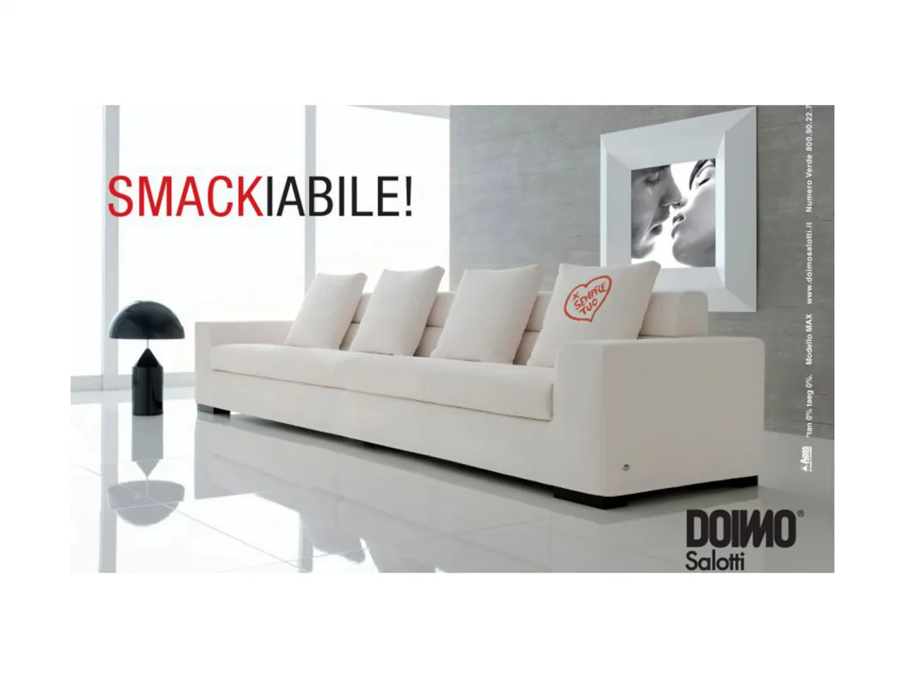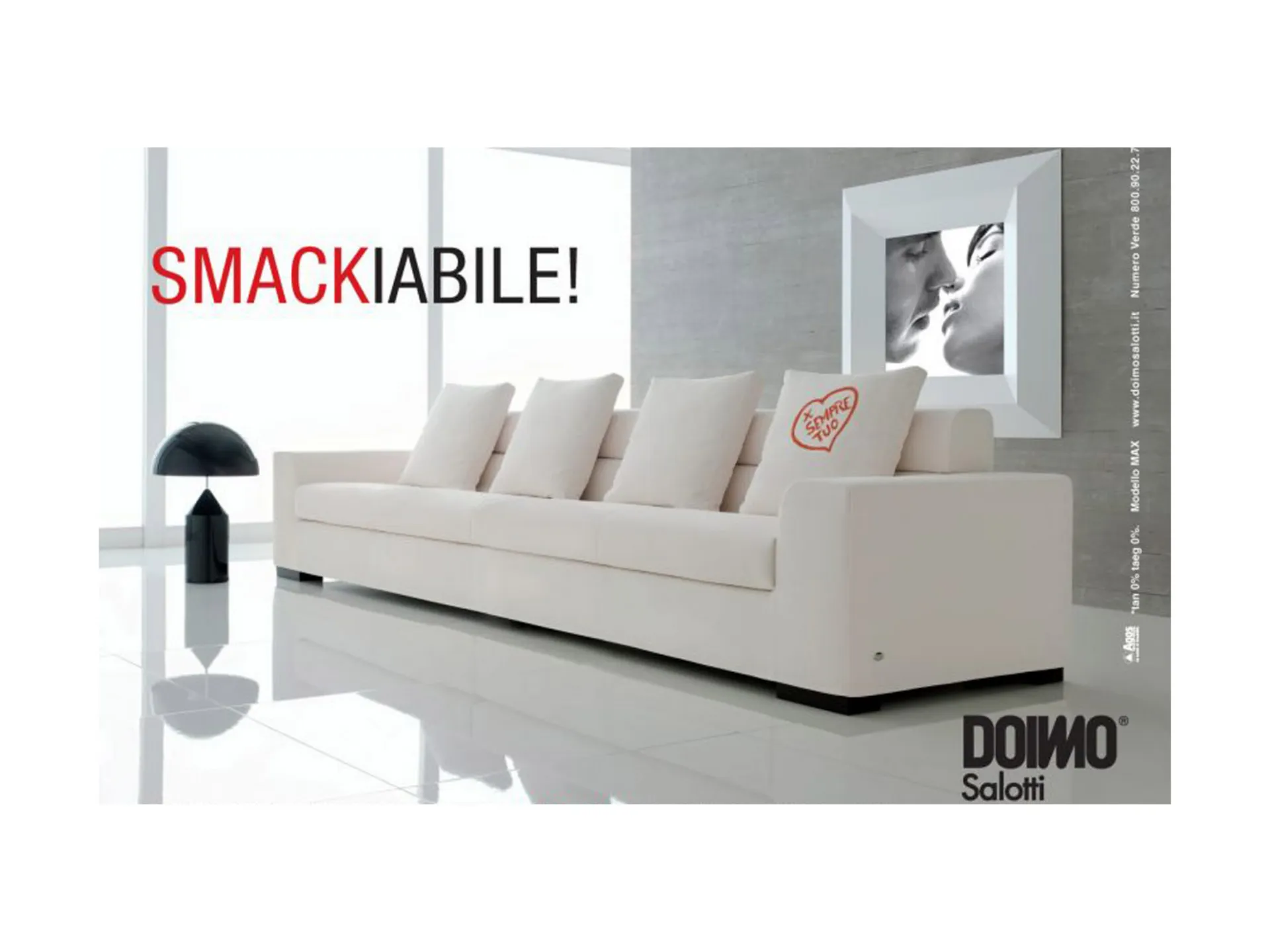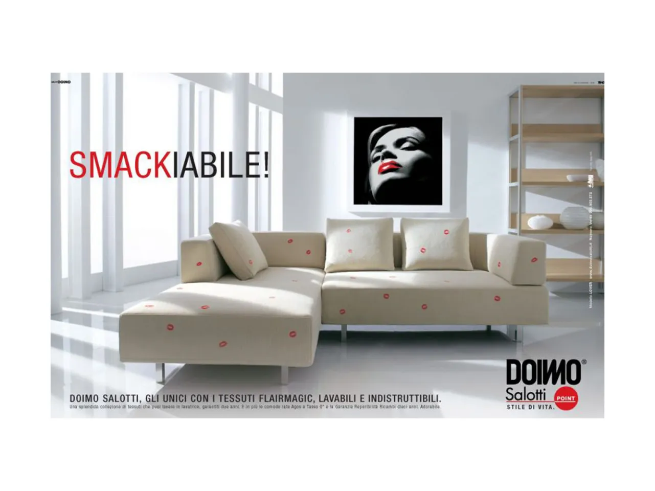 The 2006 and 2007 Press Advertising Campaign by Doimo Salotti conveys the concept of stain removal, proposing it as an important plus of our products. The Eden fabric (art. Smacchione) and the Max sofa will be the protagonists of the press campaign that will contain the proven headline "SMACKIABILE" within a decidedly fresh and innovative format.