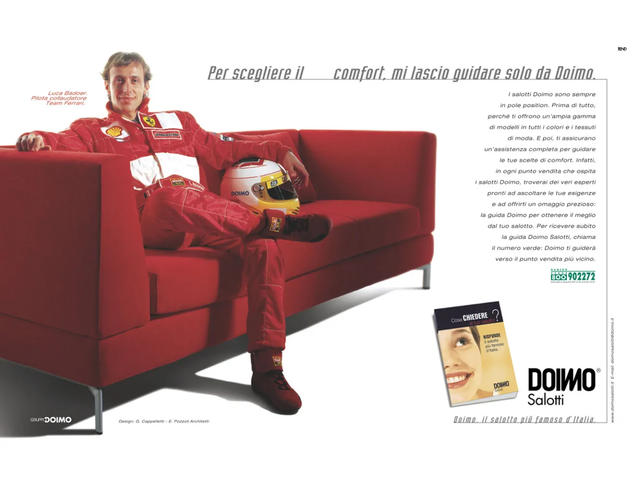 Doimo Salotti's 2001 advertising campaign had as a protagonist the Eldorado model with testimonial Luca Badoer, test driver of the Ferrari team: a perfect combination for two brands always in pole position.