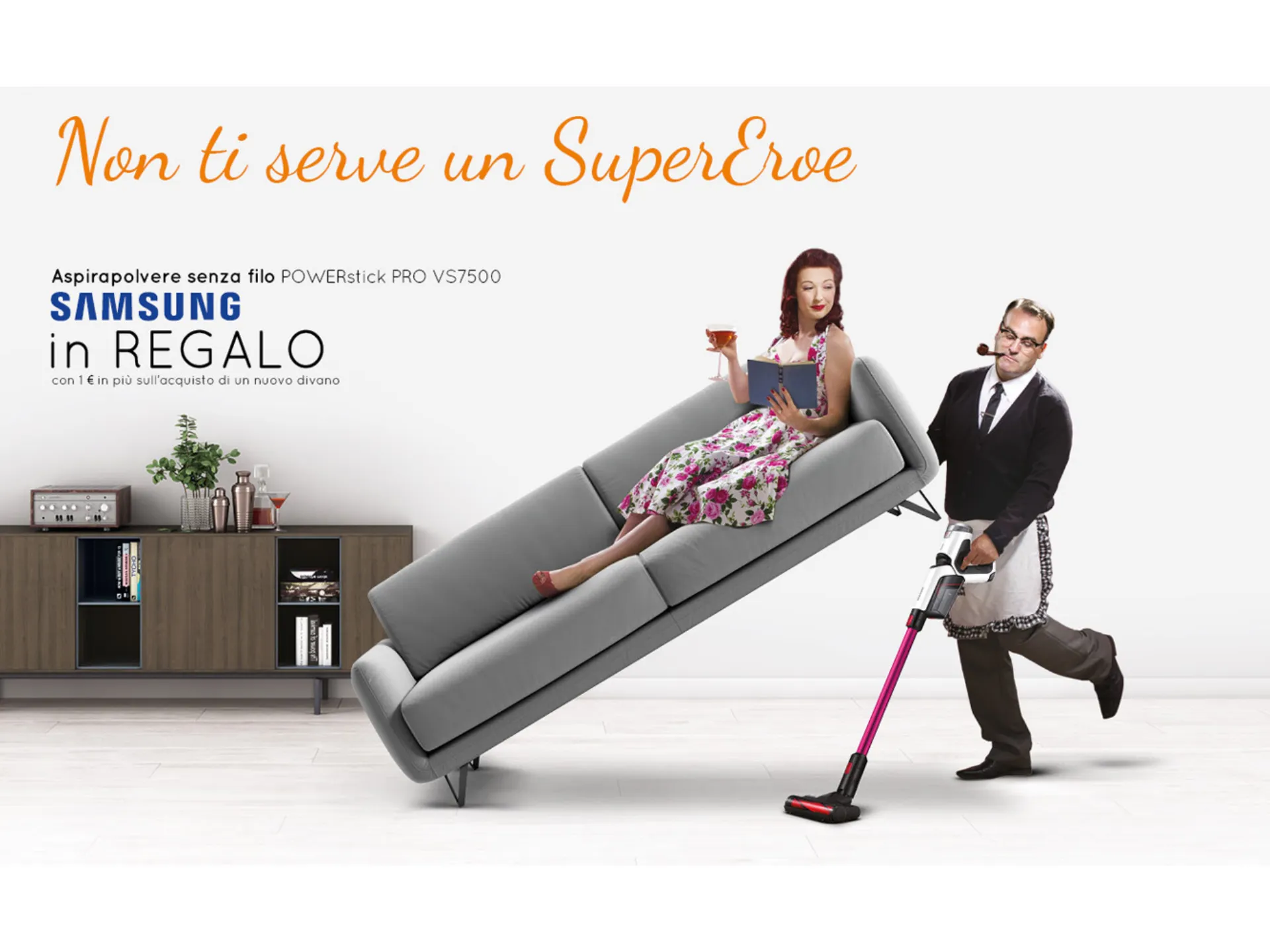 For the launch of the new Bristol sofa, we decided to present the Super Hero promotion. For a minimal expense on the purchase of a Bristol composition, with 1 more euro, the customer will have a Samsung cordless vacuum cleaner. The initiative lasted 5 months and involved a selection of authorized dealers, throughout the Italian territory.