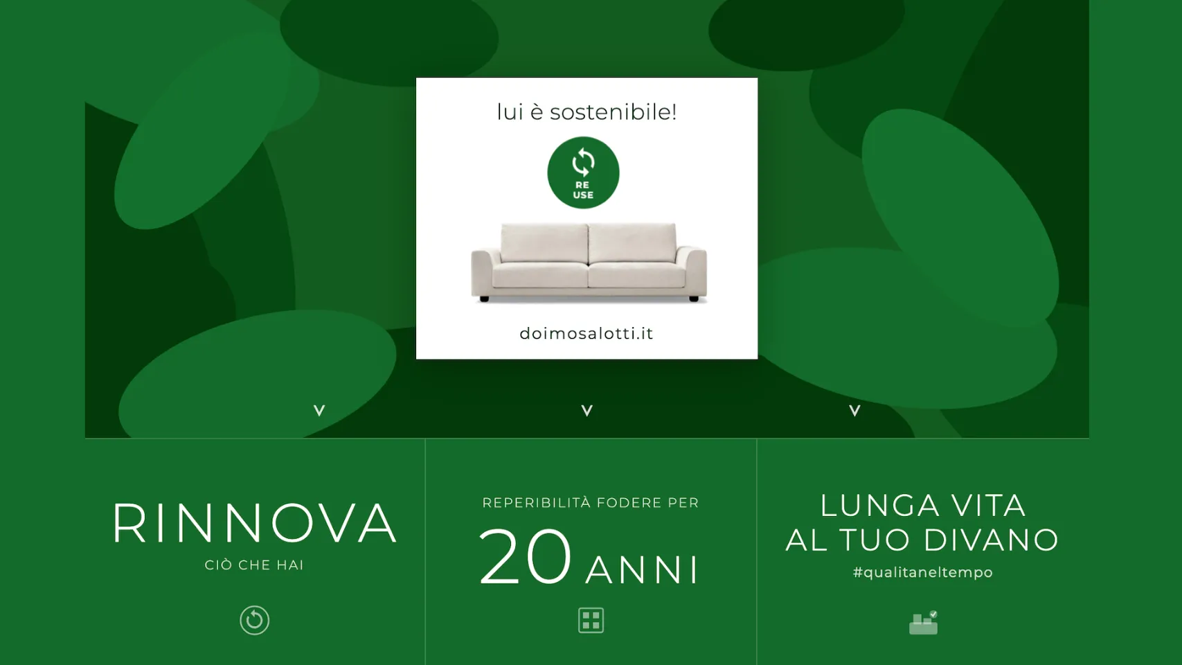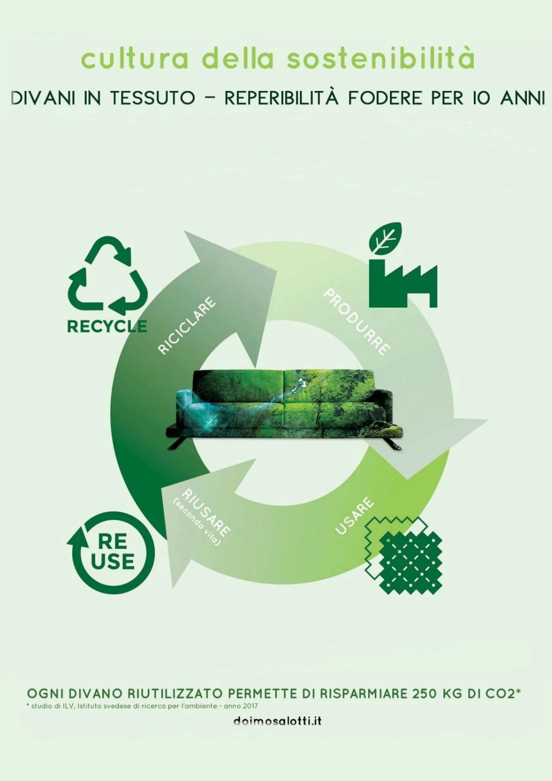 Businesses must help raise this awareness of reuse to increasingly extend the life cycle of products. We are very proud when you write to us "I have had a Doimo Salotti sofa for 20 years and it is still perfect ... can I only change the fabric of the covers?". It fills our hearts with happiness, because we know that we have done a good job. Committing to the path of sustainability is a real responsibility in which we strongly believe. We are aware that the path is still long and there will be further improvement margins not expressed here, but we are confident of achieving our goal, thanks also to your support as a conscious consumer.