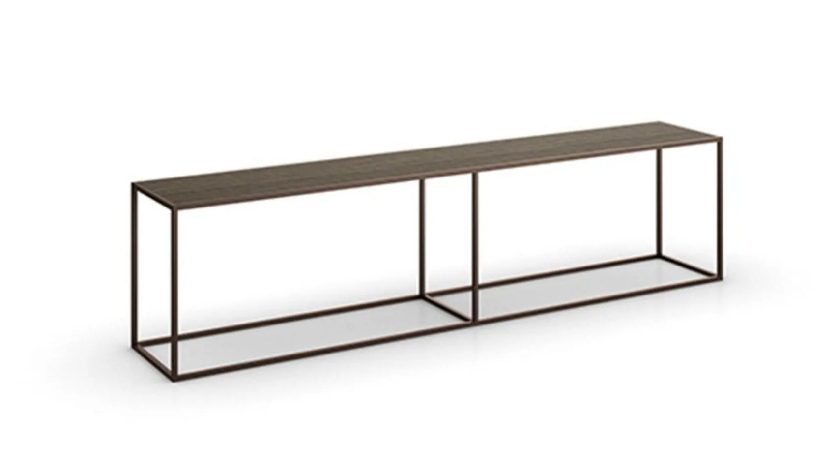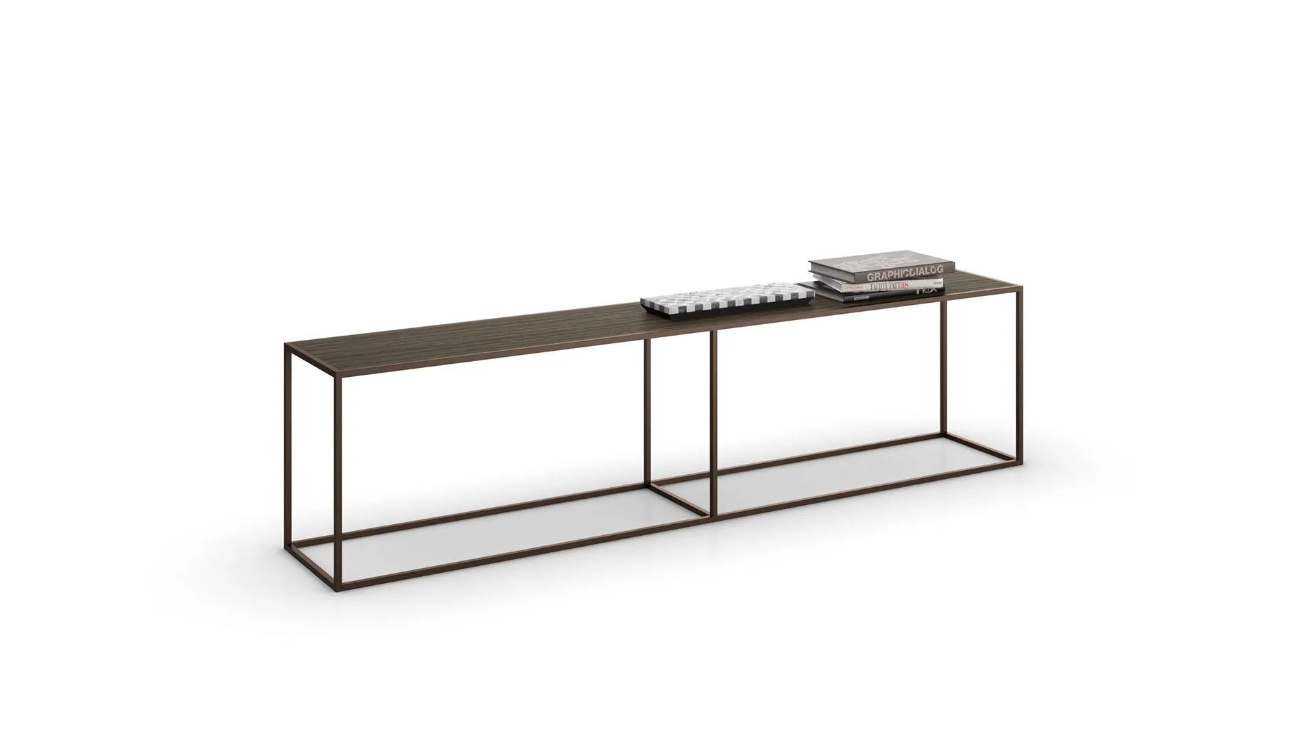 Made with a square-section metal frame in vintage bronze and a top that can be requested in a melamine, lacquer or Laminam finish.