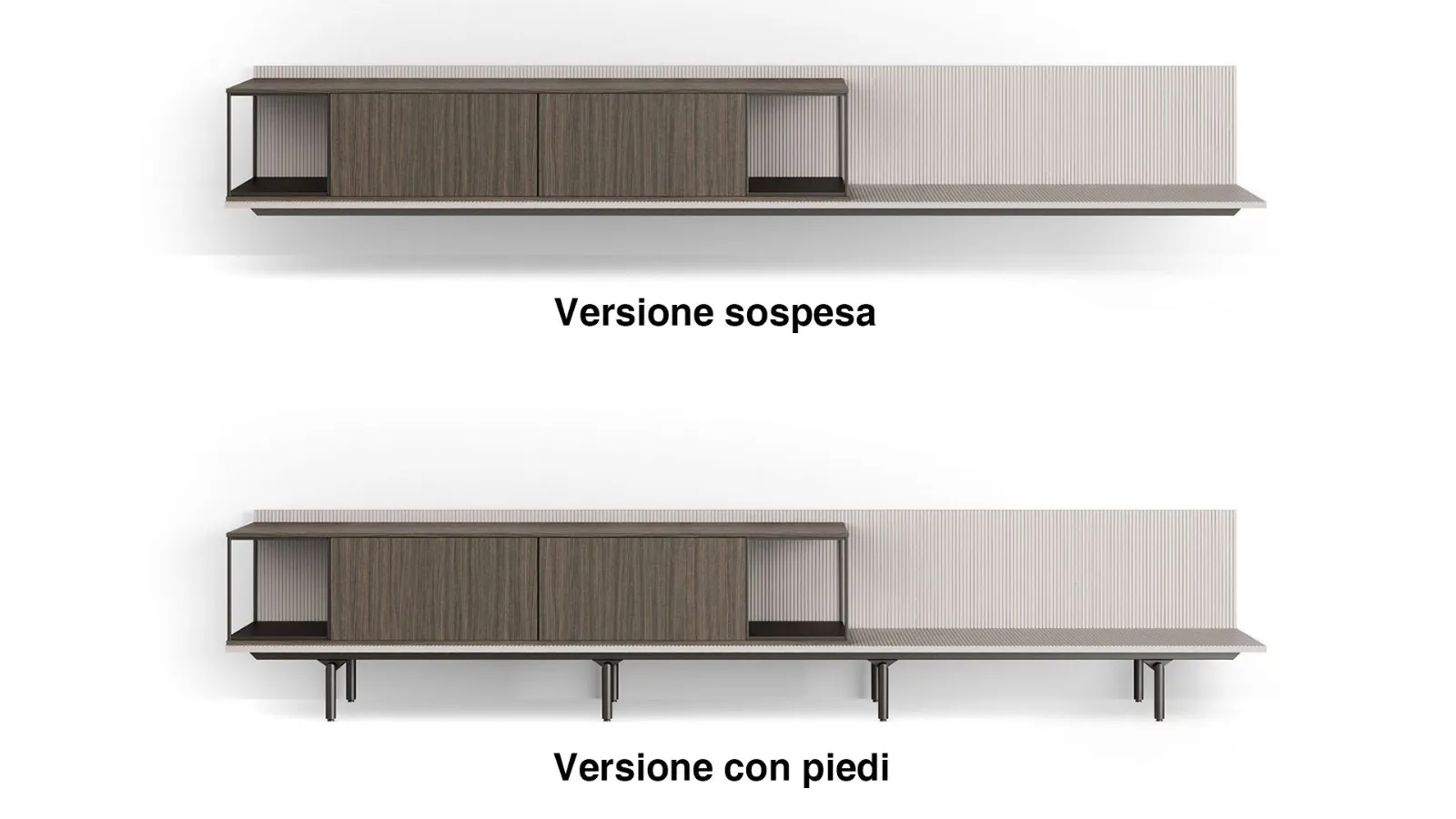 The Sasha collection allows you to choose, depending on the different living requirements, the traditional floor-standing option with feet or the lighter suspended version that can be positioned at the desired height.