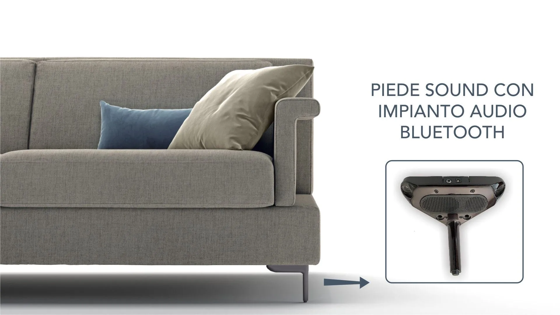 The Sound feet come with a two-way audio system with Bluetooth connection and a 12V transformer. These complete feet with speakers come as a pair and can be positioned either at the front or on the sides of the sofa or composition.