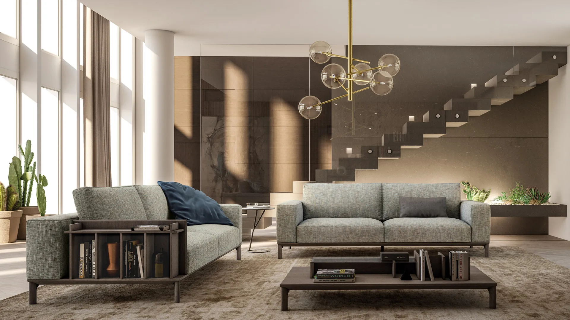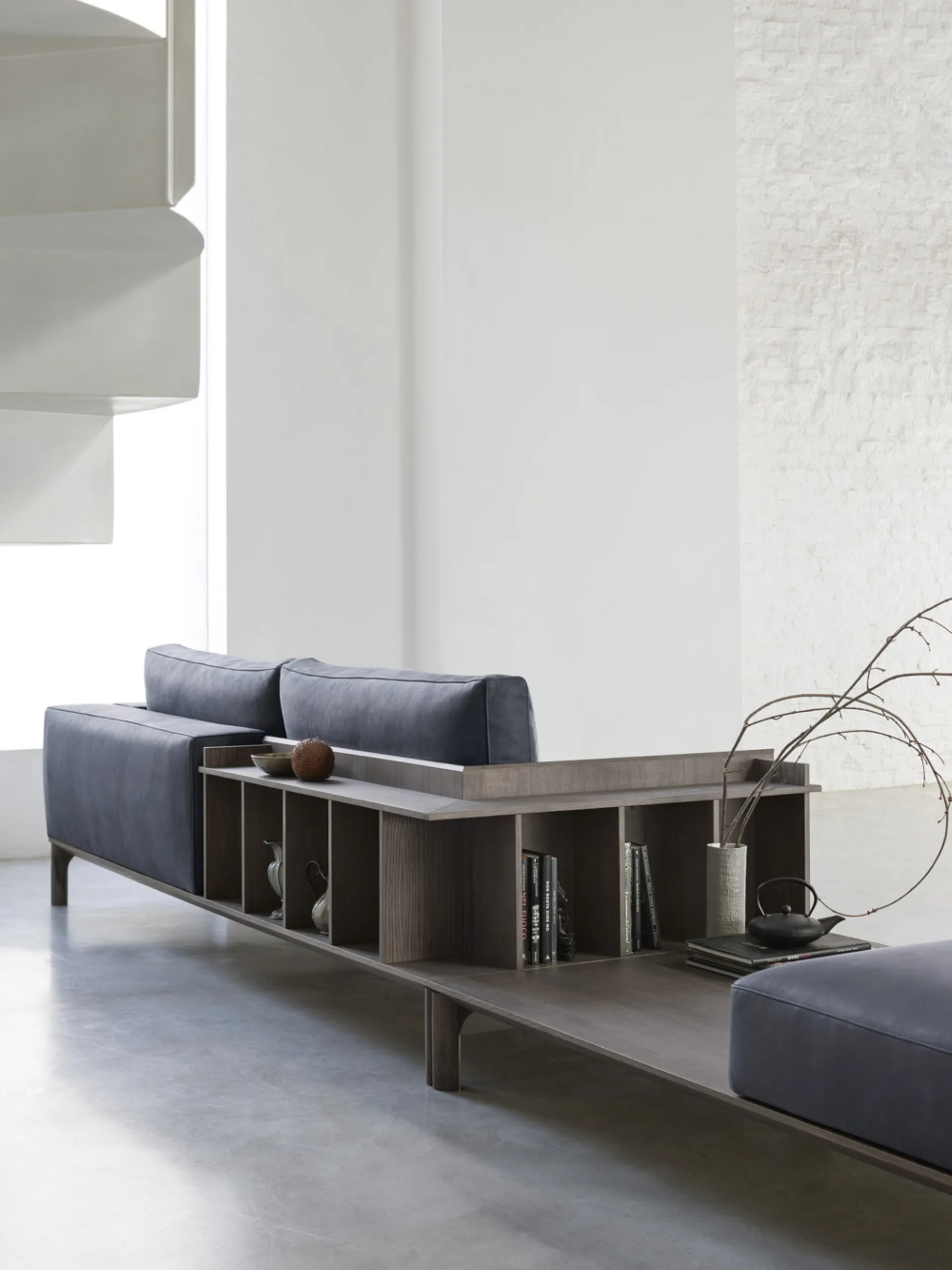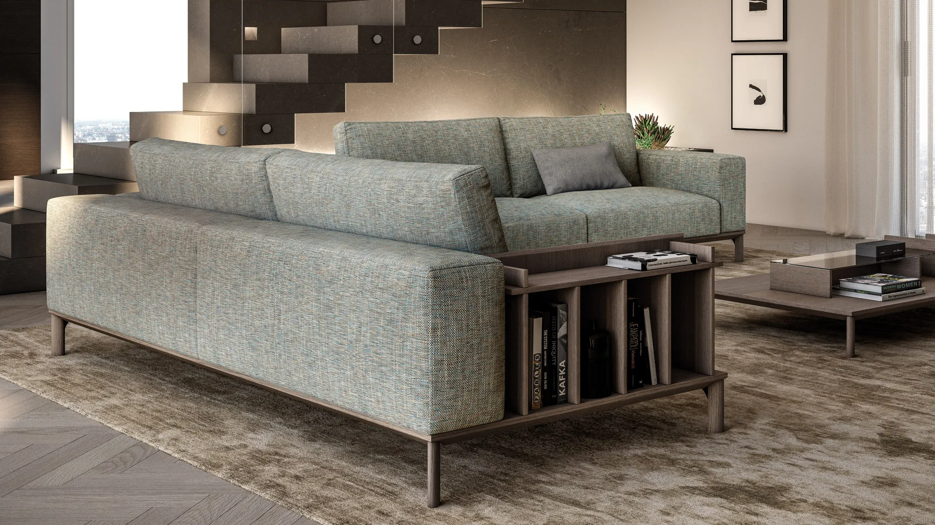 A modern, effective design that stands out to even the most discerning audience. The base supports the soft, deep seats, enclosed in a cockpit structure, in which the armrest is also developed with clear, hand-finished lines with sartorial skill. The accessory elements, such as shelves, shelves and wooden bookcases, harmonise with the seats and backrest with extreme naturalness, creating a piece of furniture that is not only valuable but also highly functional.